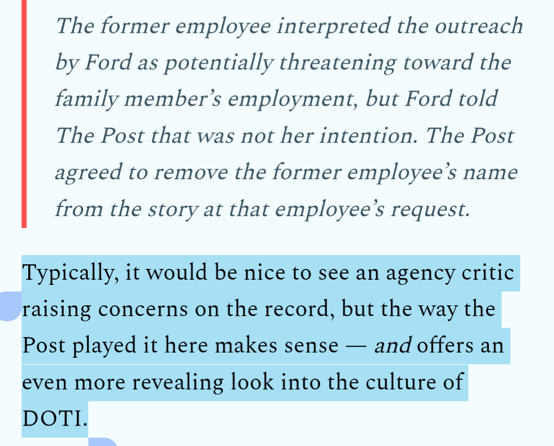 The DOTI director reaching out to family members to obtain the Post's source's contact information is bad enough. However the real story may be in the lack of leadership from the Mayor's office and the cultural rot at the core of DOTI creating an environment that drives turnover and discontent.